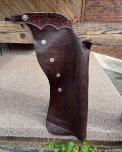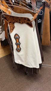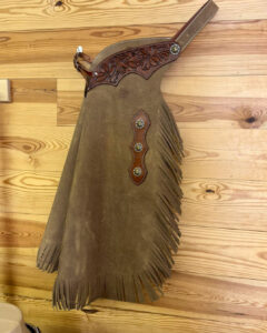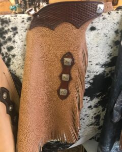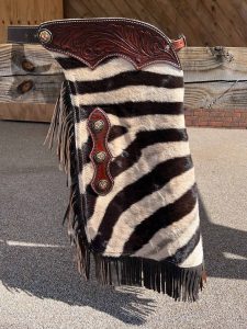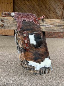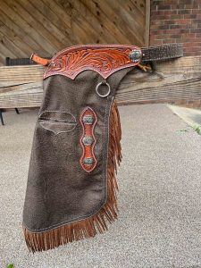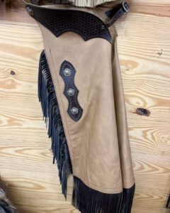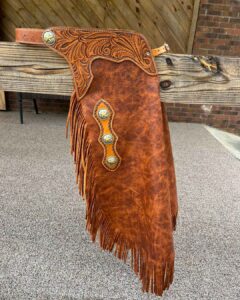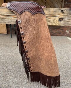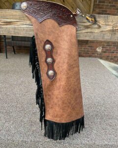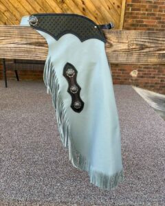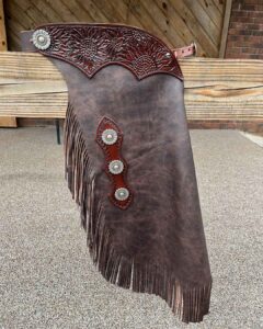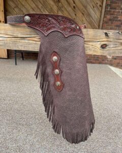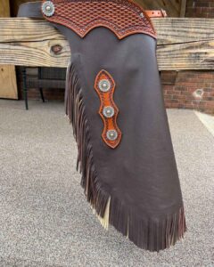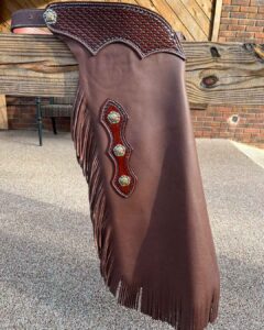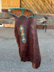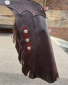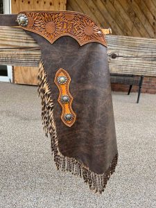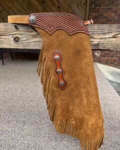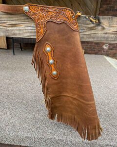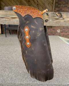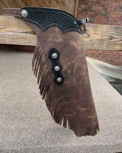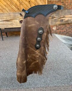 Chinks are similar to chaps, but are shorter, typically hitting the rider below the knee but above the ankle. They are fastened around the rider’s legs by snaps, buckles, or other fasteners, but the fasteners stop above the back of the knee, allowing the chinks to move more freely from that point downward. The fringe on chinks is also usually longer and more prominent than fringe found on chaps. D & S Custom Leather chinks are individually made and unique!